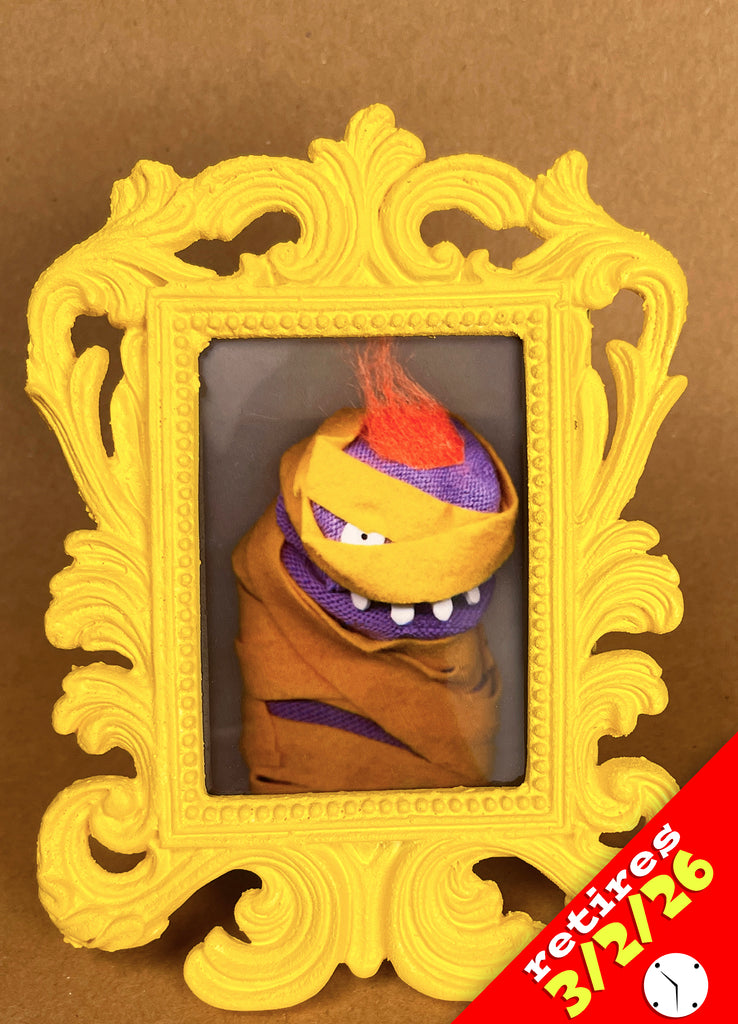 - Each Sock Puppet Portrait is printed on archival paper, hand-framed, and finished in a 3.5” x 4.5” hand-painted baroque mini-frame.